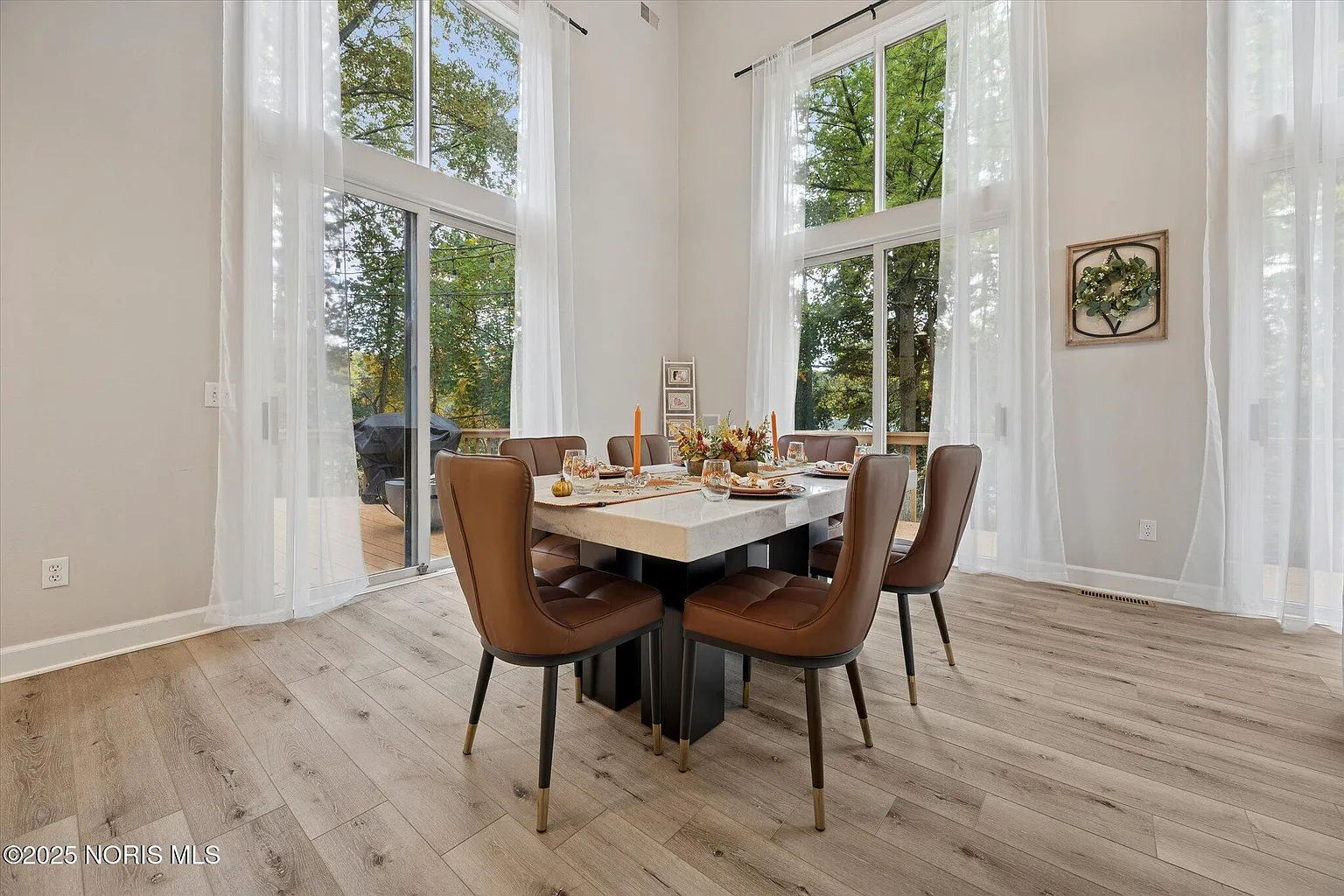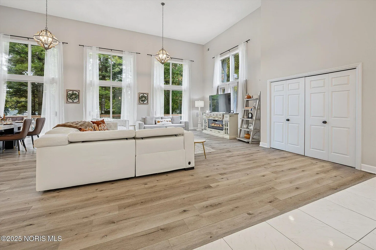 Stepping inside, the attention to detail and quality craftsmanship are immediately apparent. The grand two-story great room serves as the centerpiece of the home, featuring expansive windows that flood the space with natural light and showcase panoramic views of the surrounding trees. A wet bar adds a touch of sophistication, making this the perfect space for entertaining family and friends or enjoying quiet evenings by the fire.