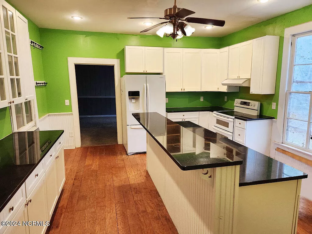 The kitchen features lots of storage and a center island. There are large covered front and rear porches and sits on a large lot.